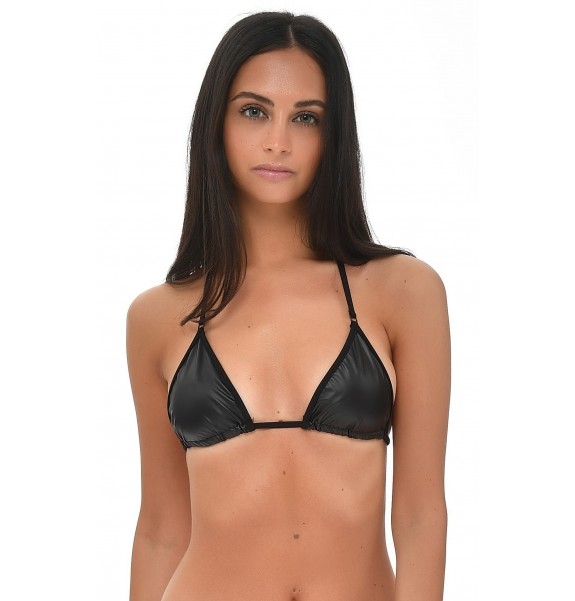 Reggiseno a triangolo, fatto in tessuto eco pelle nero elasticizzato. Reggiseno sensuale ed accattivante dona un effetto intrigante ed unico. Prodotto non idonea ad essere usato in Spa o simili. Prodotto realizzato interamente in Italia da laboratori specializzati, provenienza del tessuto 100% Made in Italy
